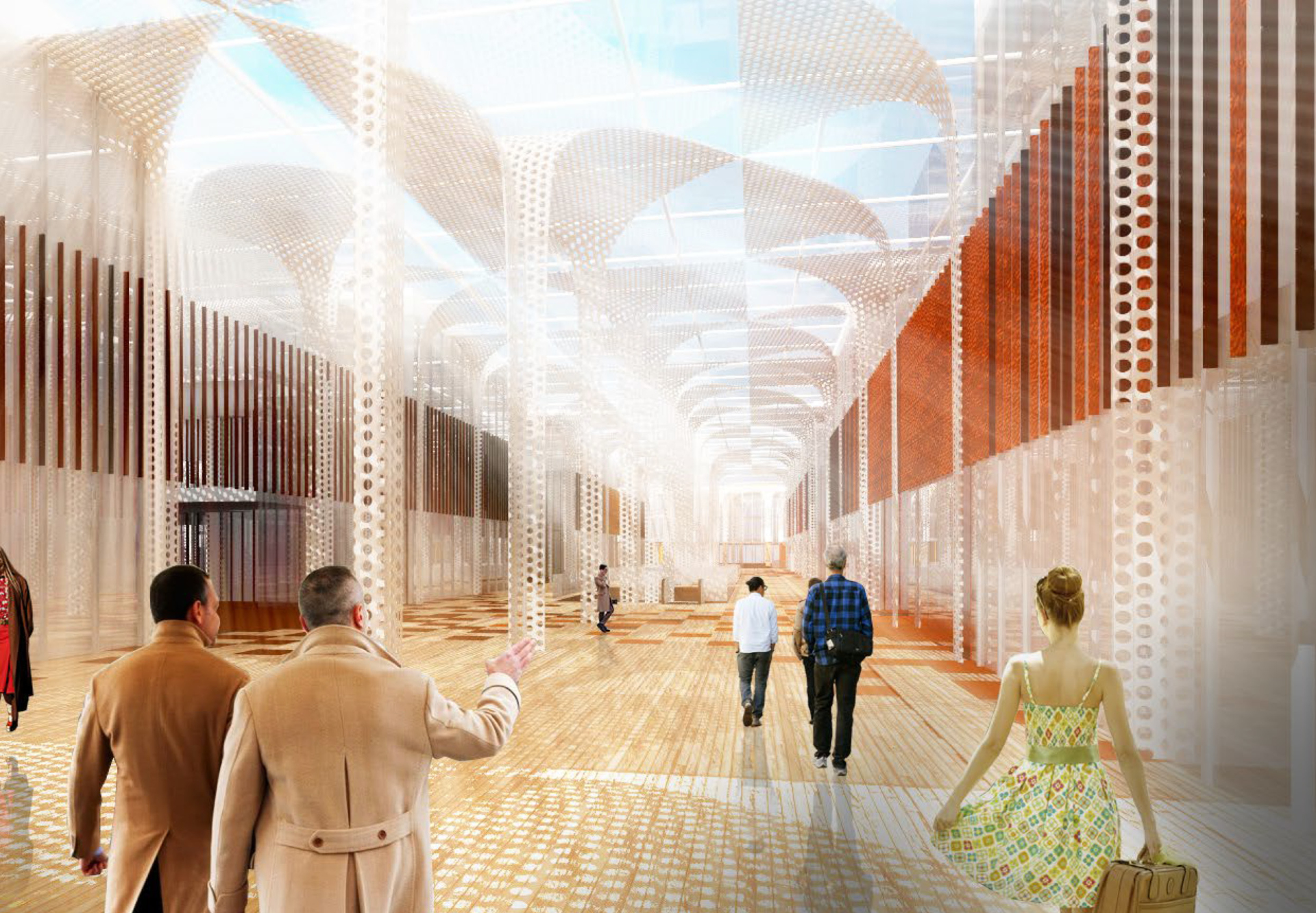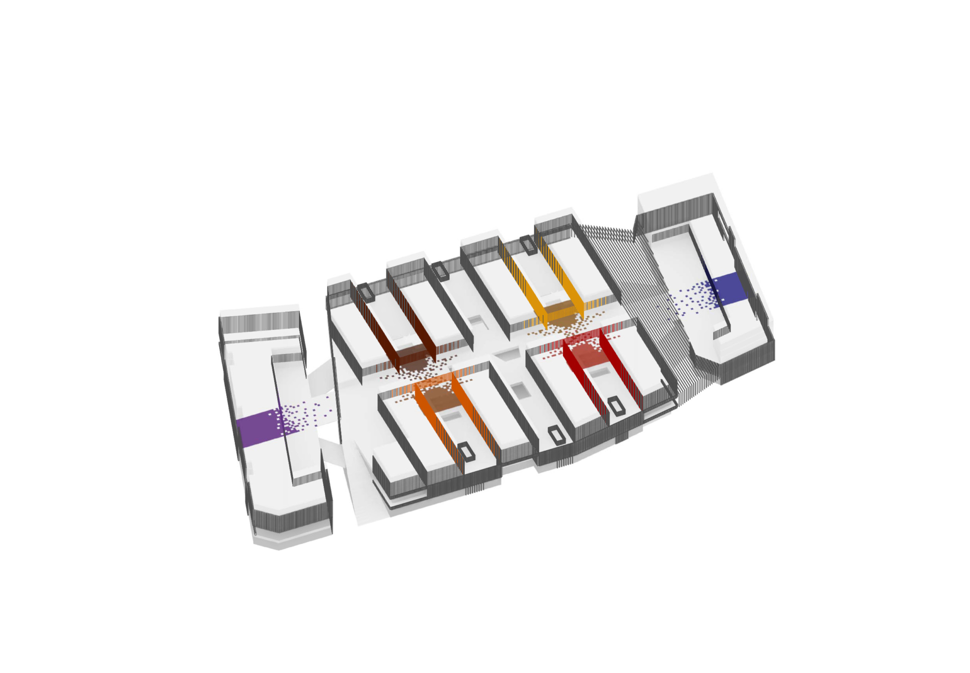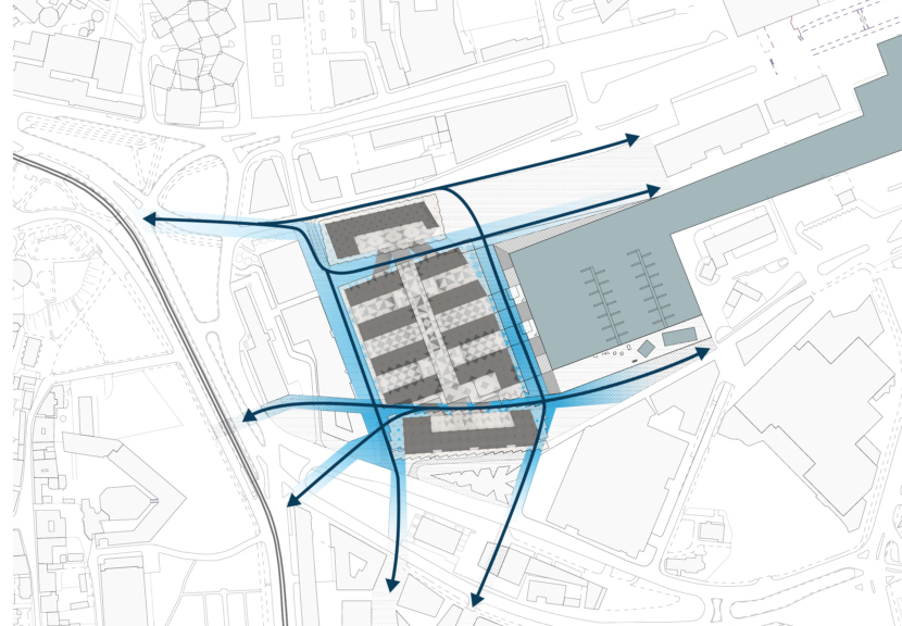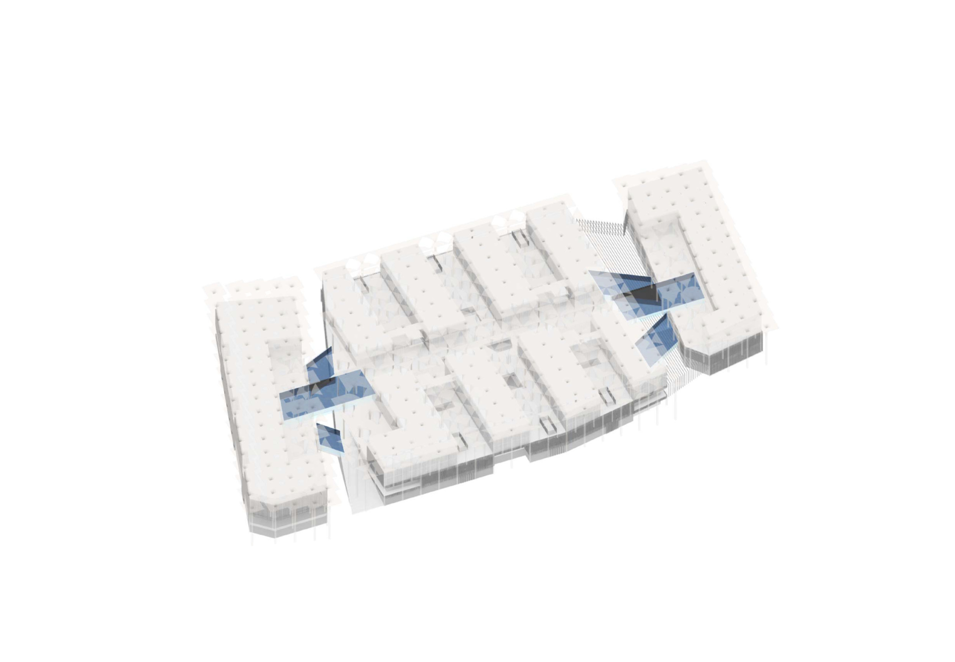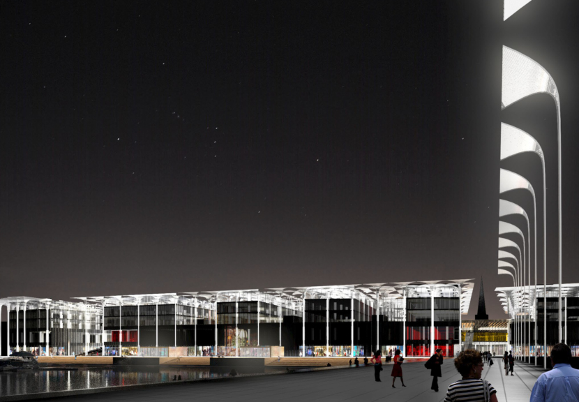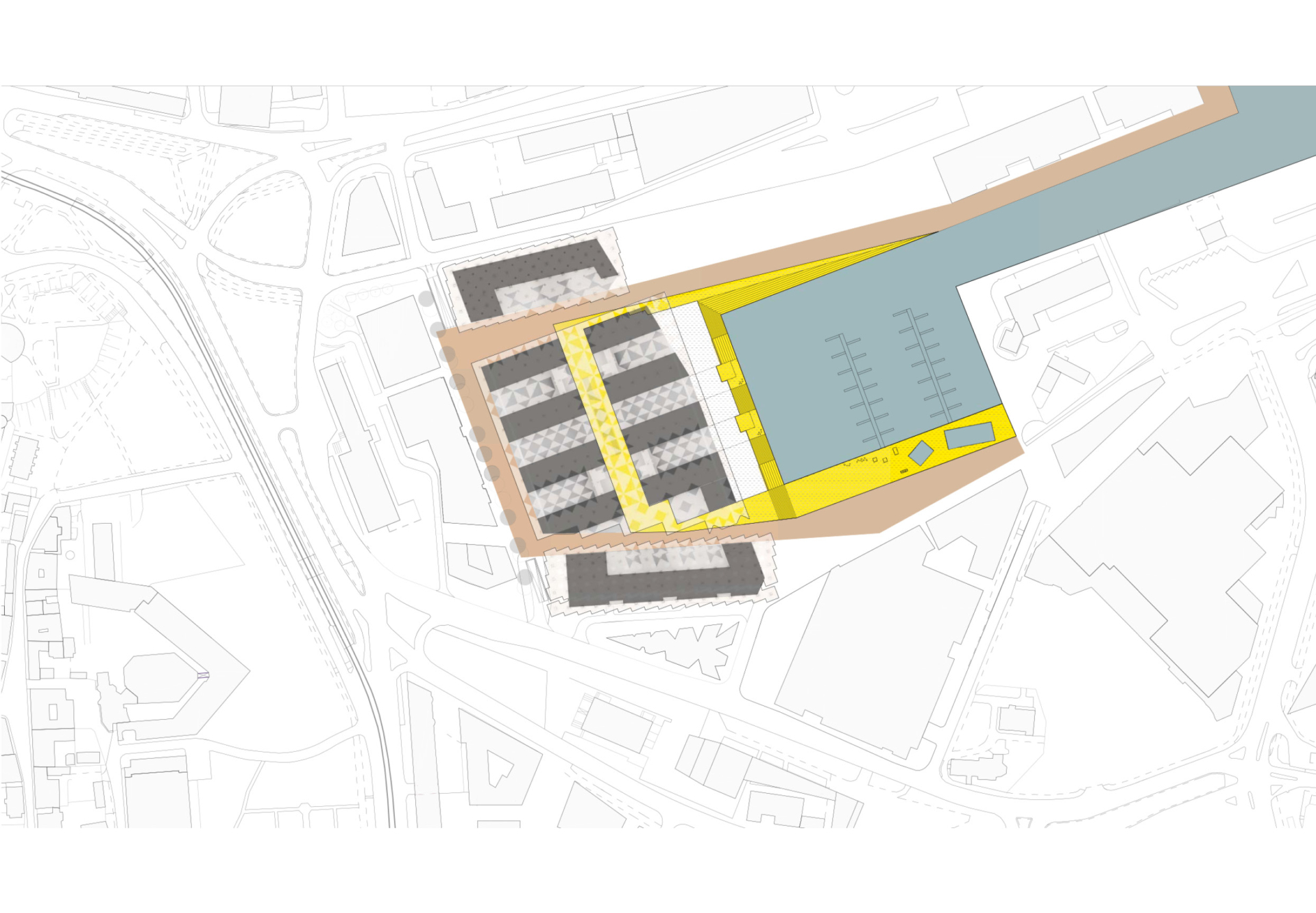 The space between the buildings and the water is designed as a stepped public landscape, where a broad stair gently connects street level with the waterfront. Here the promenade, the centre’s visitors and café terraces come together in direct contact with the water. Around the Admiralty Basin a multi-layered urban space emerges: an active street level and bridges on the first and second floors, office galleries above with views towards the Old Town and the basin, all framed and completed by the water surface itself. These layers are tied together into a coherent whole by stairs, platforms and galleries, connecting the basin, its perimeter, the surrounding city space and the semi-public interior gallery of the centre.