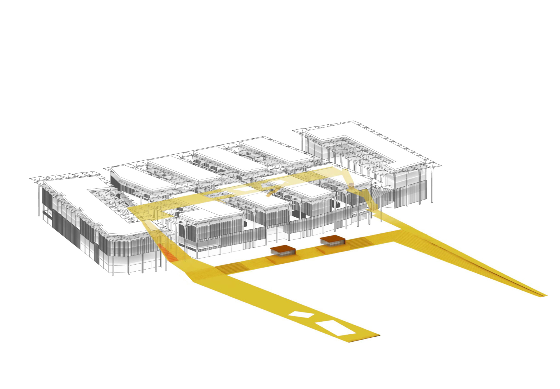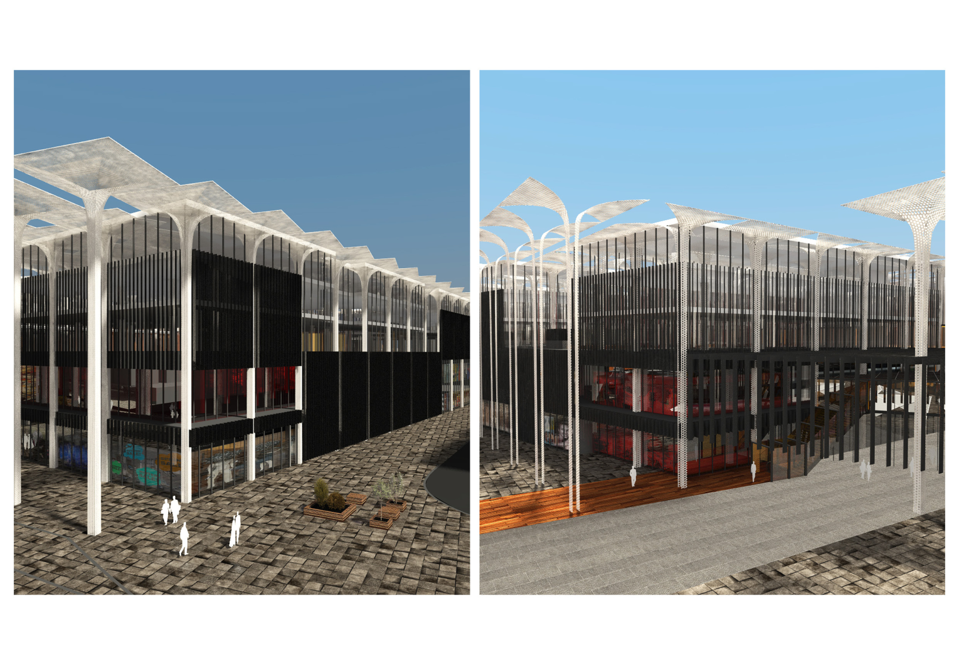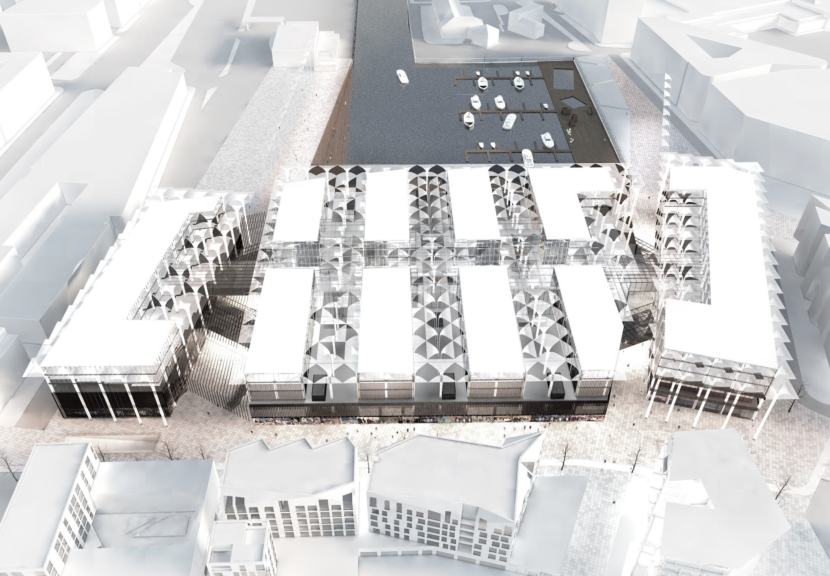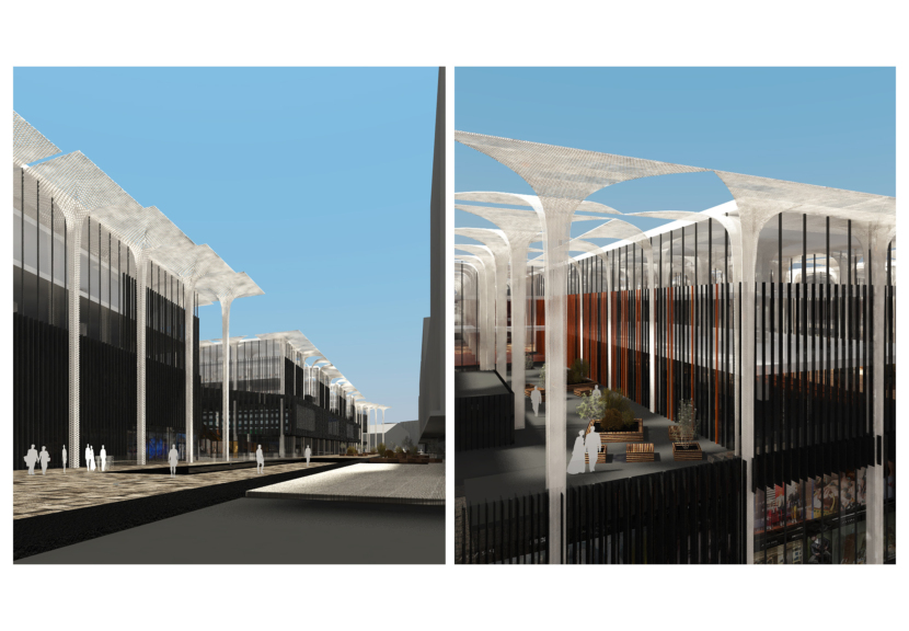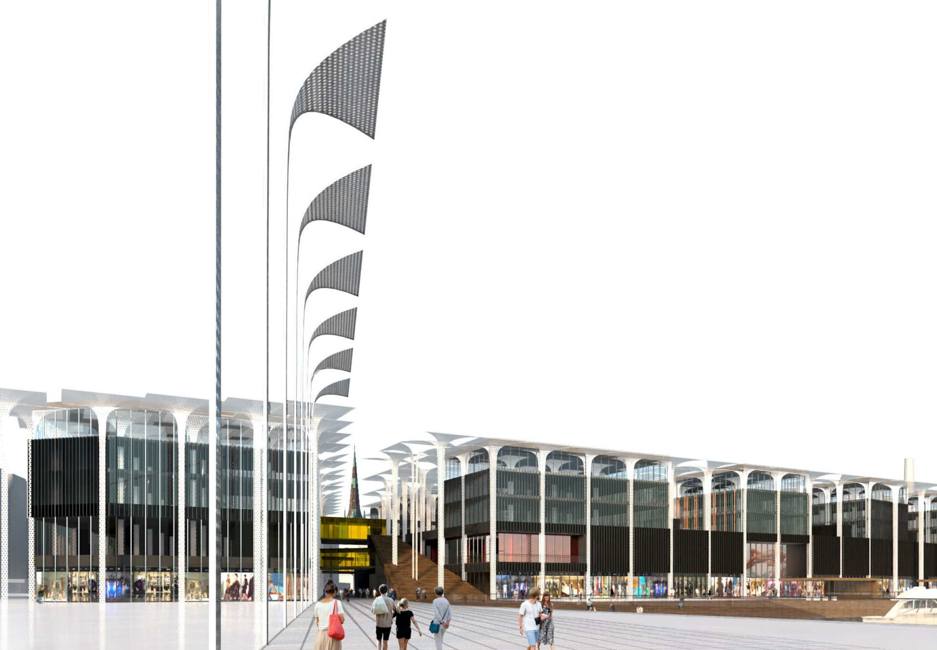 Architecturally, the complex is conceived as a contemporary “market hall”, its landscape formed by a monumental colonnade and a light roof structure growing out of it. The columns frame different parts of the building, create diverse in-between urban spaces, and mark key points – the façade along the Admiralty Basin, the main entrance and primary pedestrian routes. Glass façades, shading fins and varied colours distinguishing the office volumes give the building a changing appearance that works both in daylight and in the city lights at night. In this way, a public space is created that weaves together Tallinn’s maritime identity, a contemporary city centre and a human-scaled everyday environment.