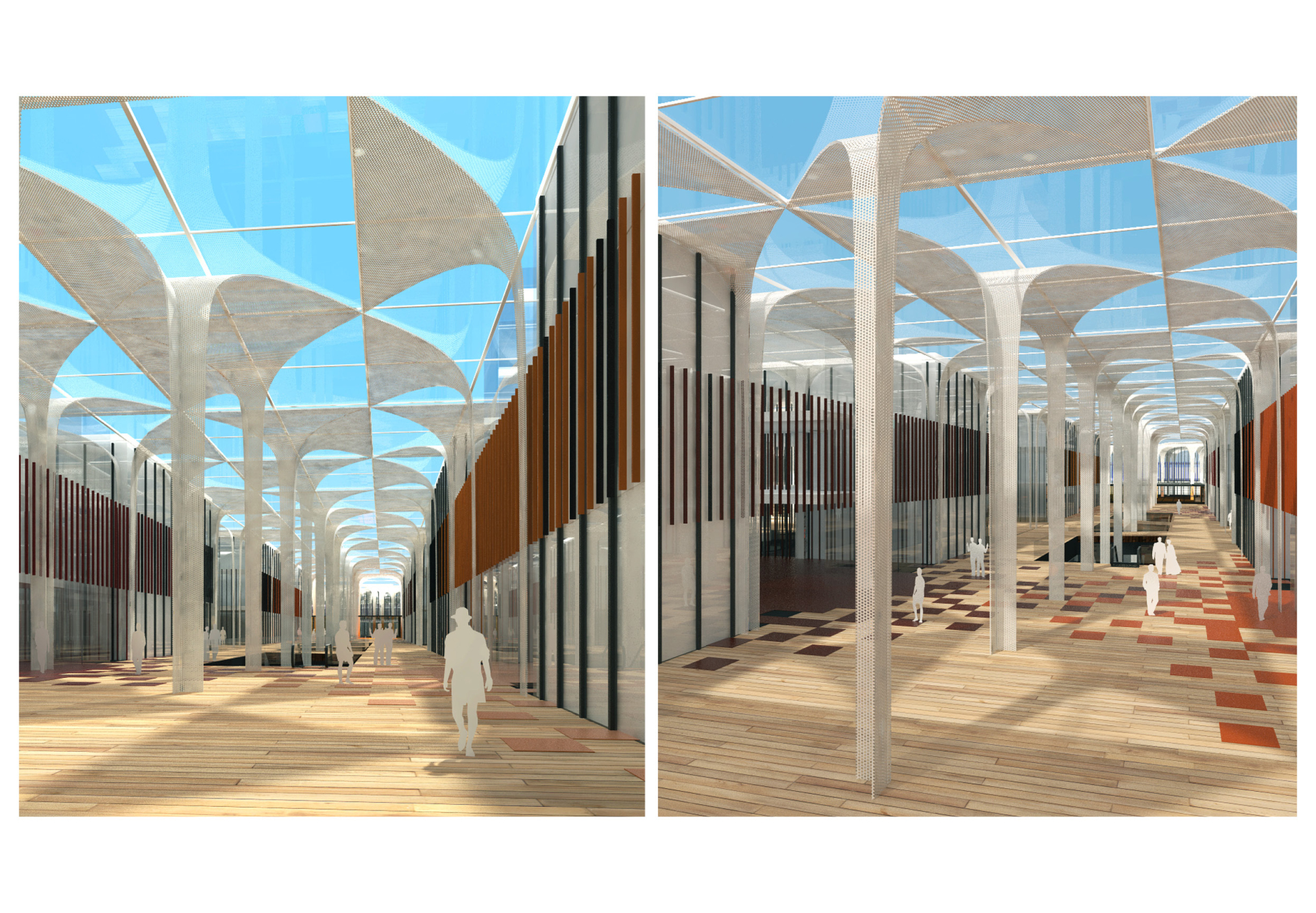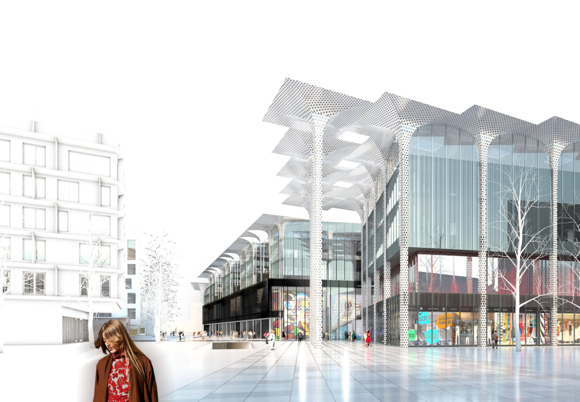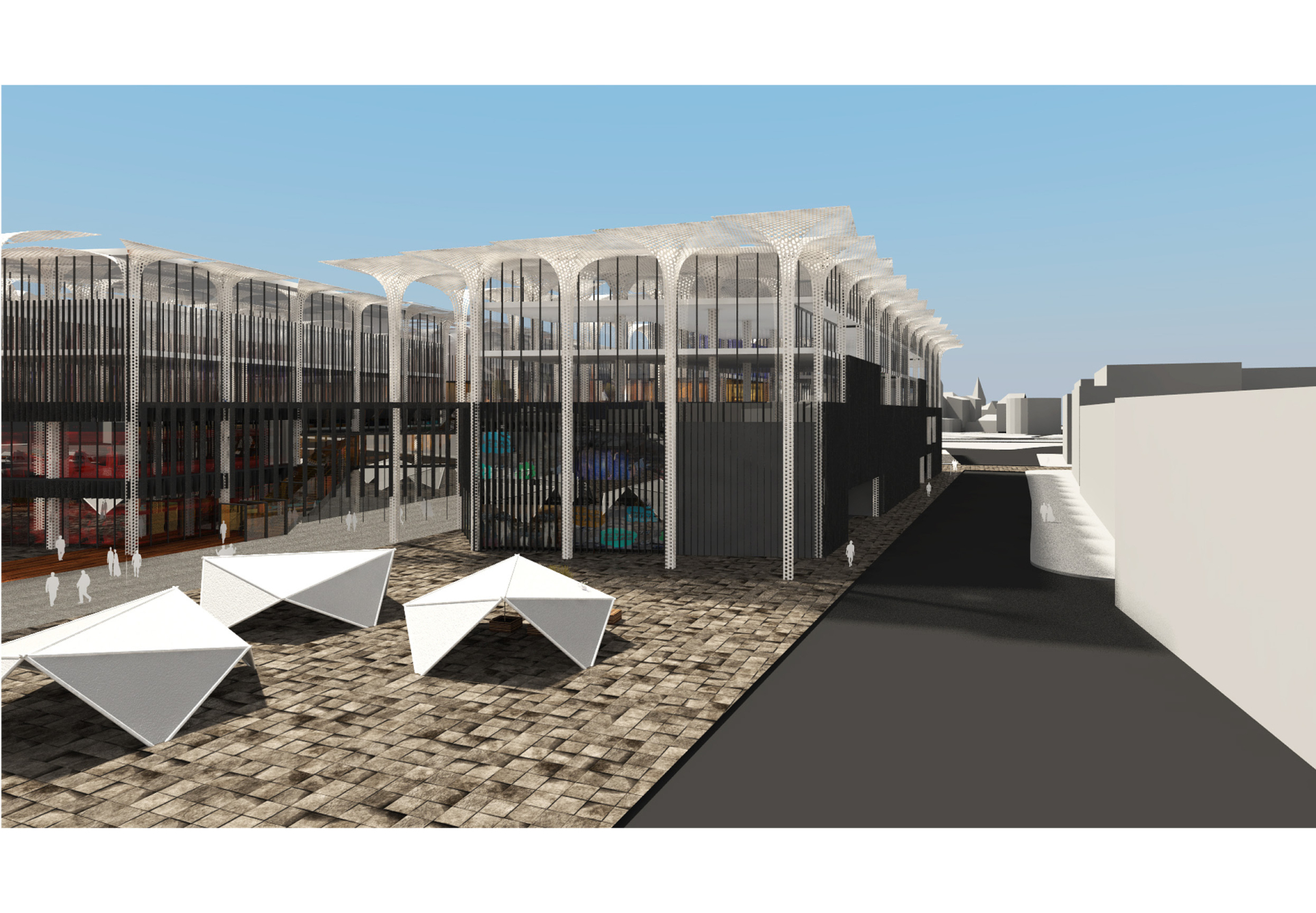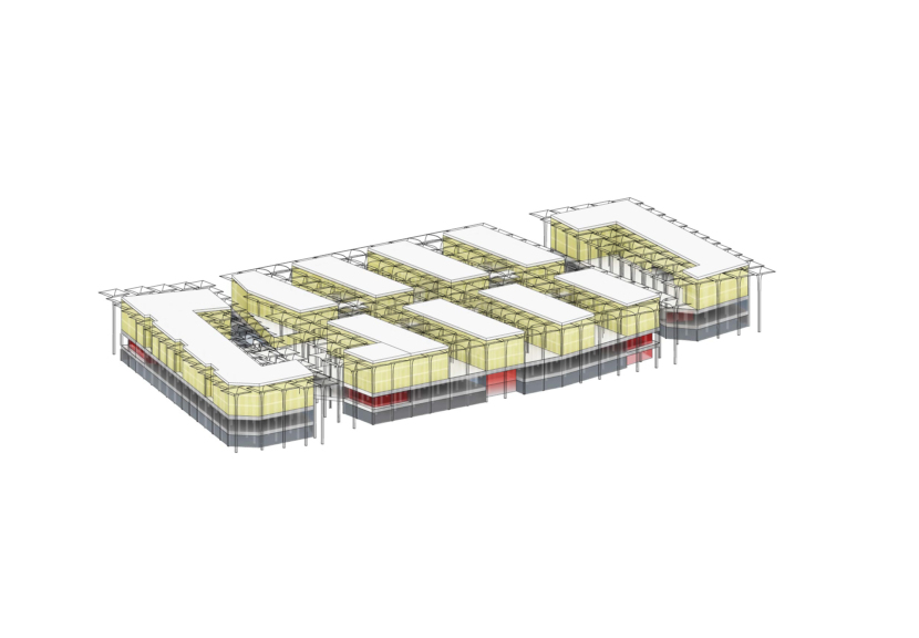 Architecturally, the complex is conceived as a contemporary “market hall”, its landscape formed by a monumental colonnade and a light roof structure growing out of it. The columns frame different parts of the building, create diverse in-between urban spaces, and mark key points – the façade along the Admiralty Basin, the main entrance and primary pedestrian routes. Glass façades, shading fins and varied colours distinguishing the office volumes give the building a changing appearance that works both in daylight and in the city lights at night. In this way, a public space is created that weaves together Tallinn’s maritime identity, a contemporary city centre and a human-scaled everyday environment.