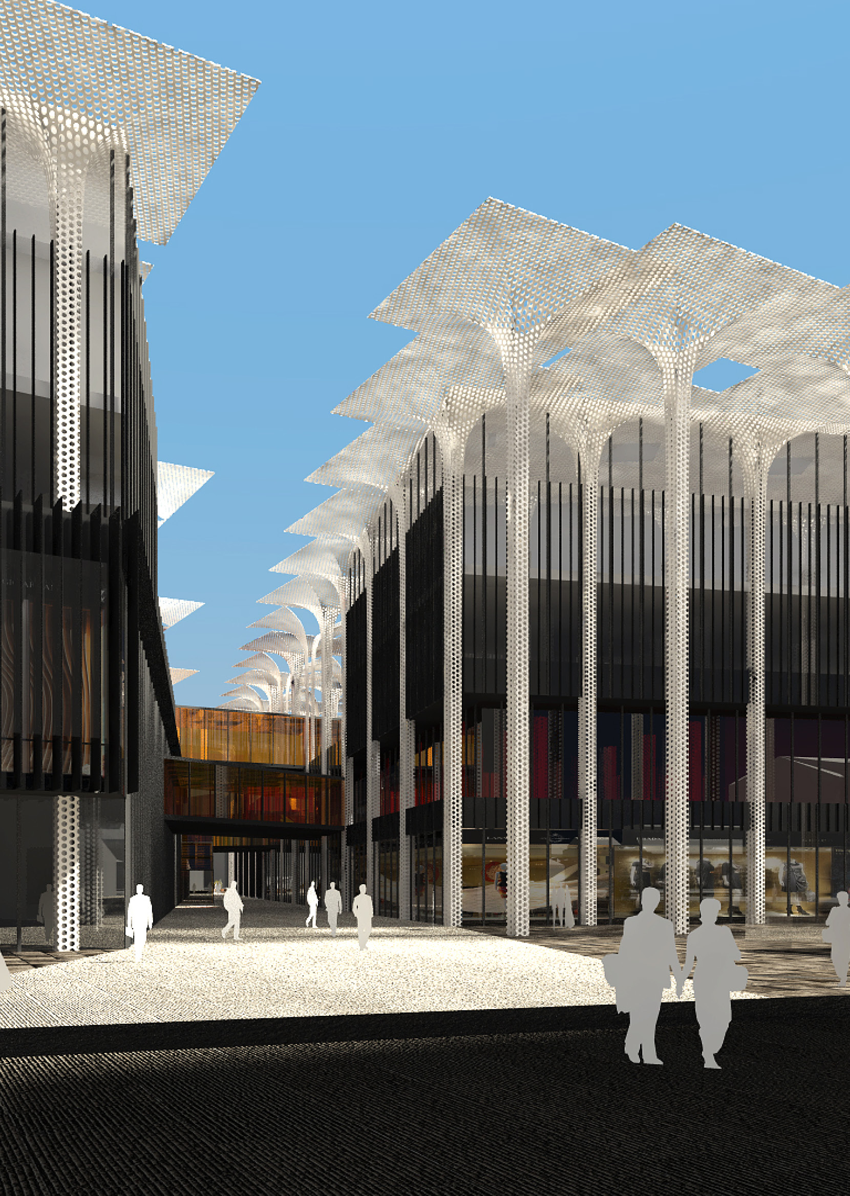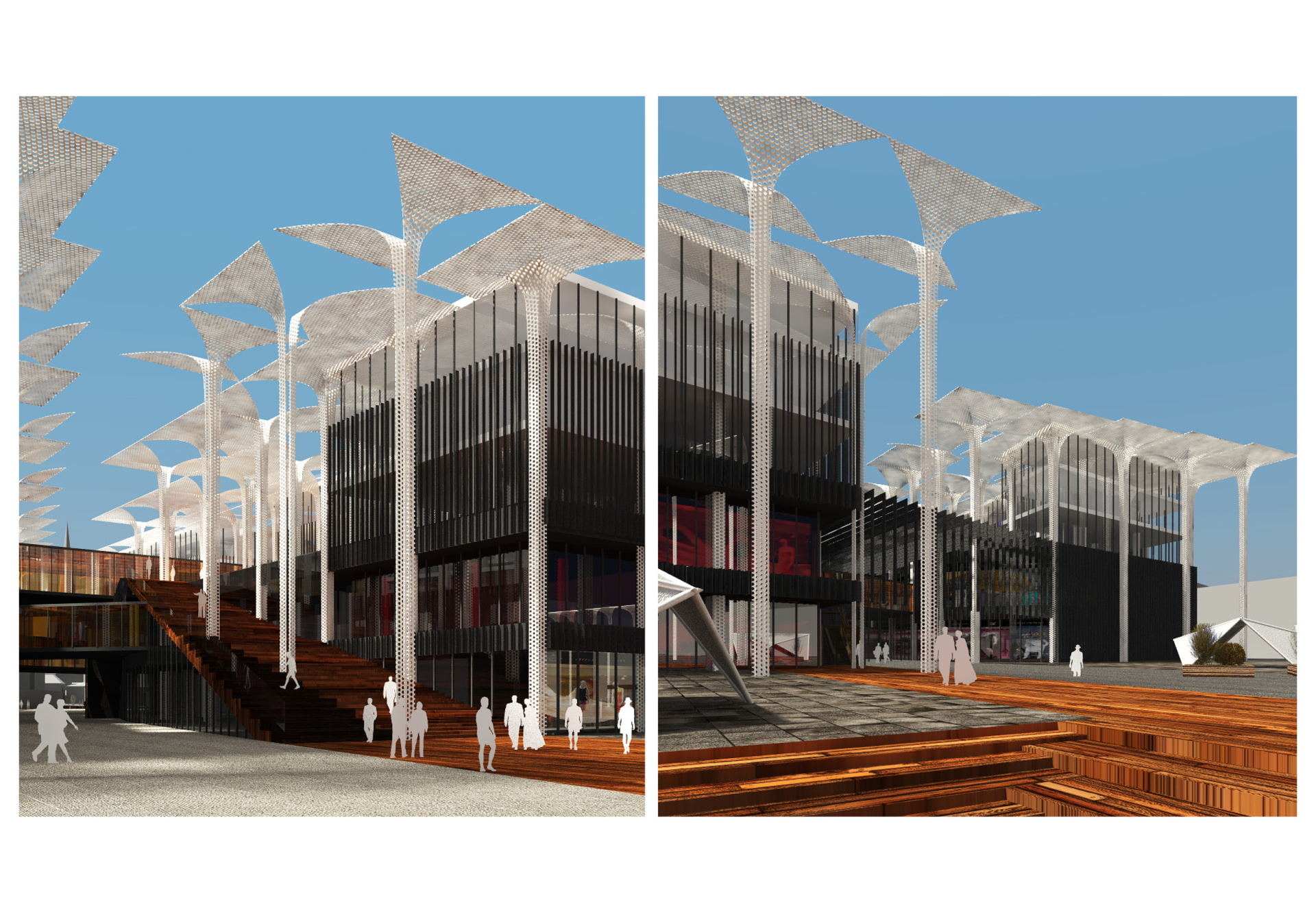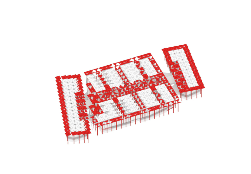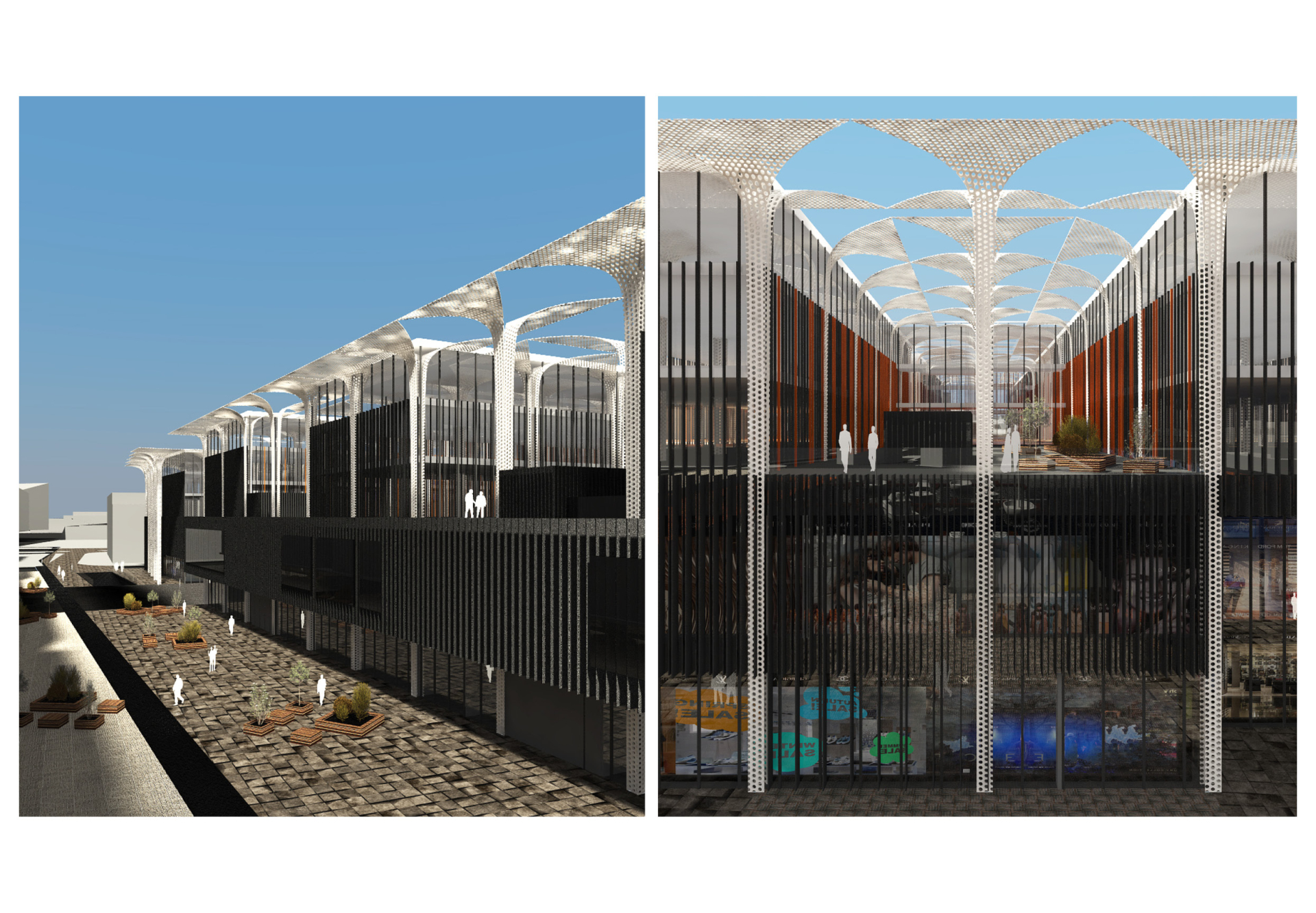 Architecturally, the complex is conceived as a contemporary “market hall”, its landscape formed by a monumental colonnade and a light roof structure growing out of it. The columns frame different parts of the building, create diverse in-between urban spaces, and mark key points – the façade along the Admiralty Basin, the main entrance and primary pedestrian routes. Glass façades, shading fins and varied colours distinguishing the office volumes give the building a changing appearance that works both in daylight and in the city lights at night. In this way, a public space is created that weaves together Tallinn’s maritime identity, a contemporary city centre and a human-scaled everyday environment.