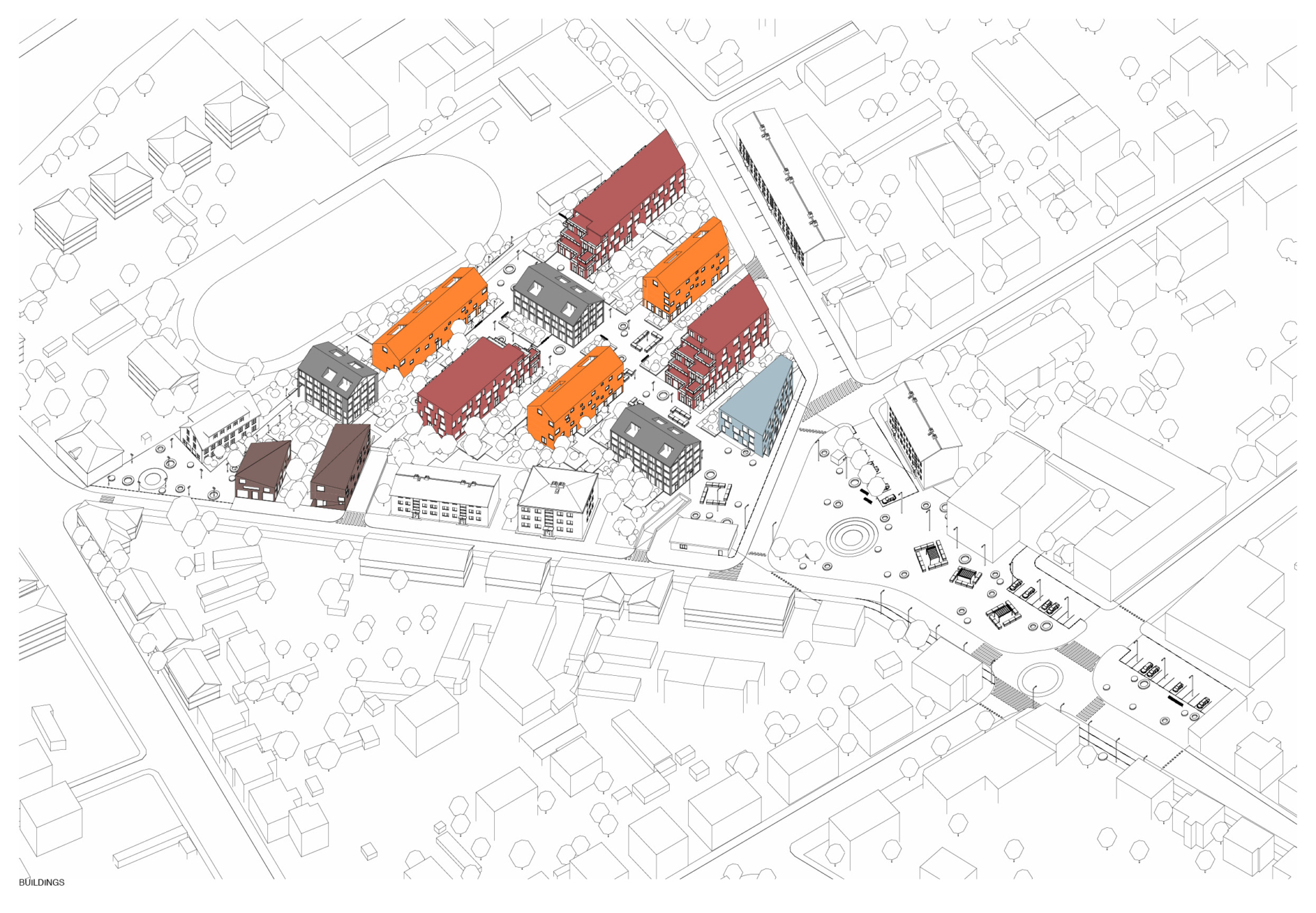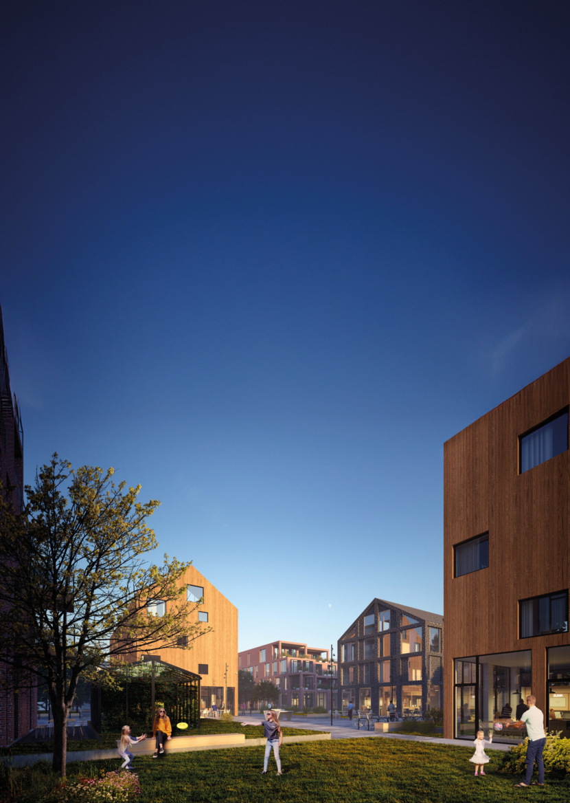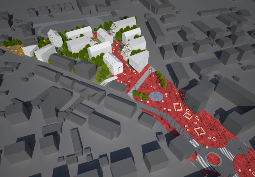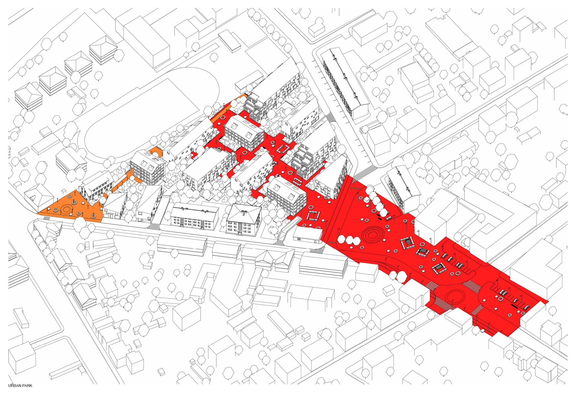 The street level is active and people-focused: ground-floor commercial spaces, cafés and shops open directly onto the square and light-traffic routes, keeping the area lively throughout the day. Smaller plazas, play areas and resting spots between the buildings create space both for children’s play and for quiet relaxation.