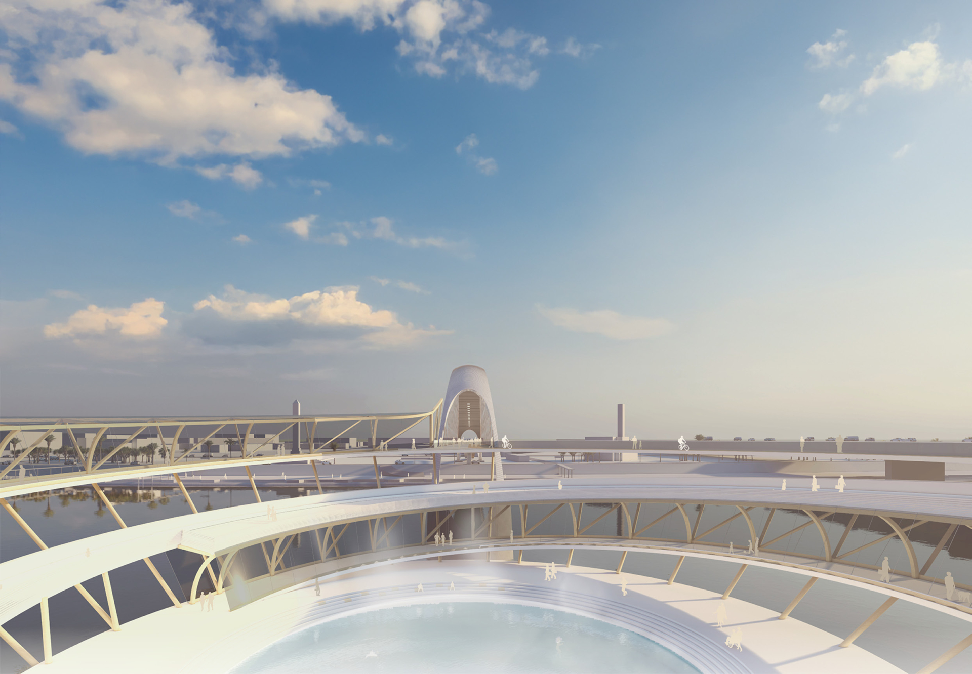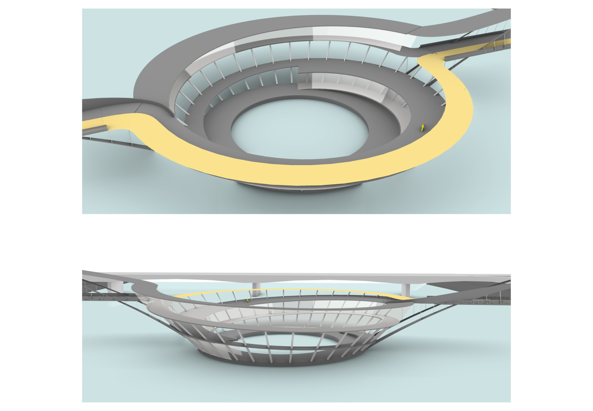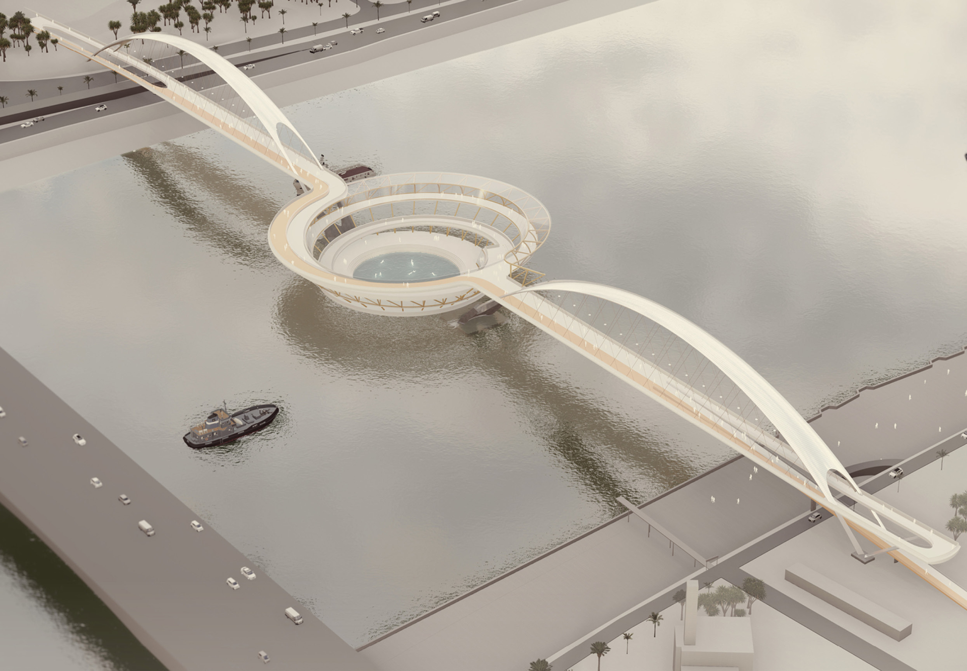 The aim of a bridge is to give new place for everyday activities throughout the journey. The deck becomes a linear plaza with two pace options. One is to use fast line as a quick crossing and the other gives an opportunity to have a stroll by going up and down the helix down to the Nile. The fast line gives easy access also for cyclists keeping in mind that new modes of movement have to be implemented to aim towards a more sustainable future.