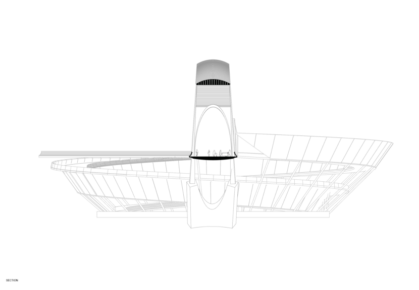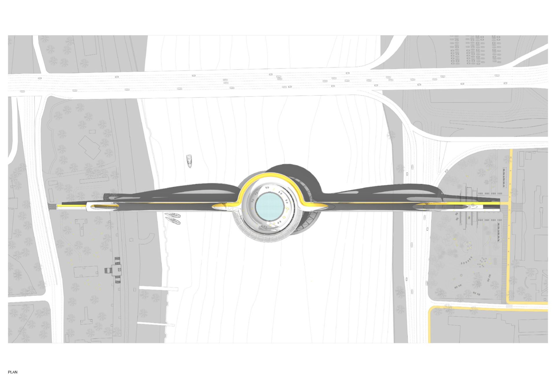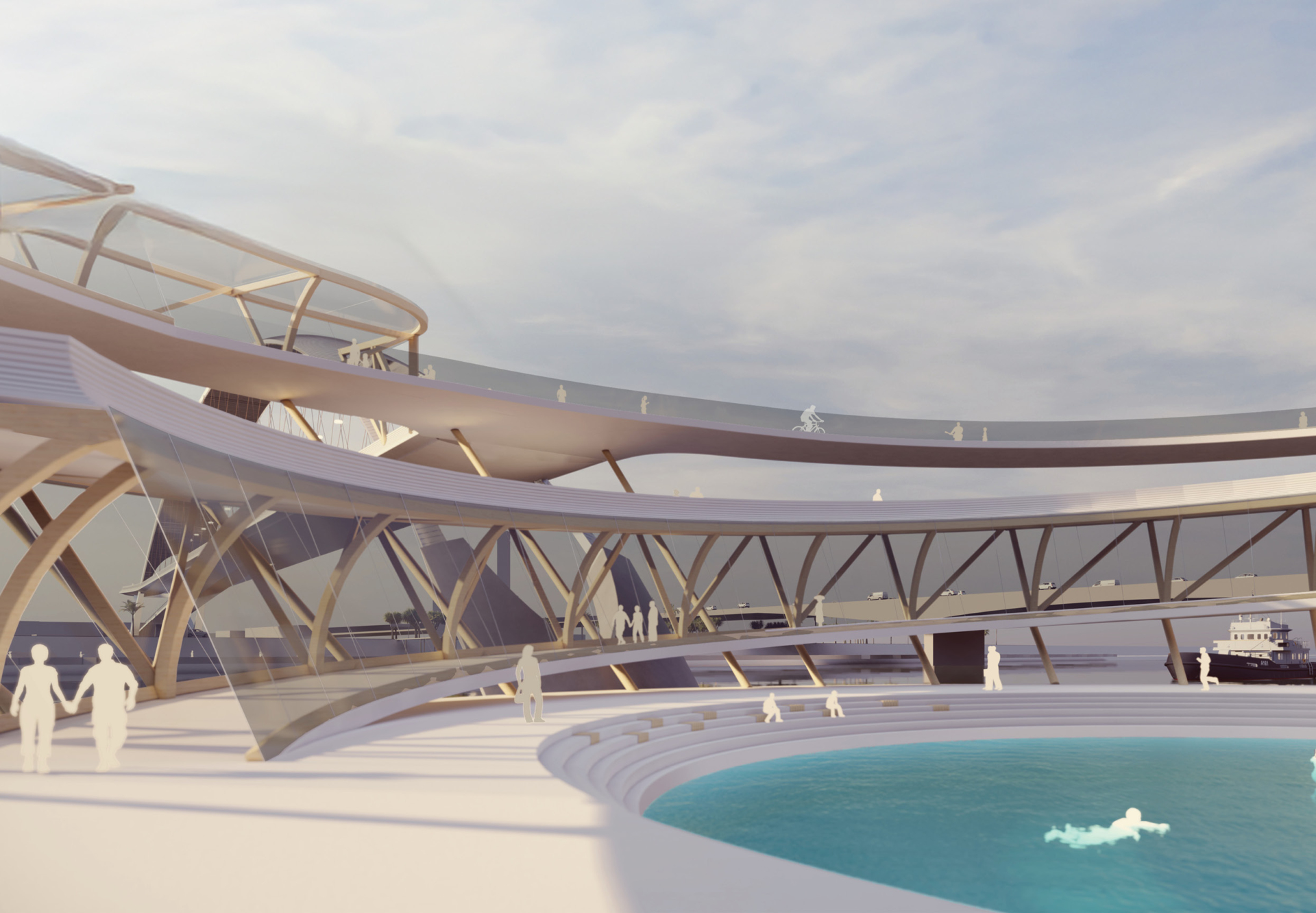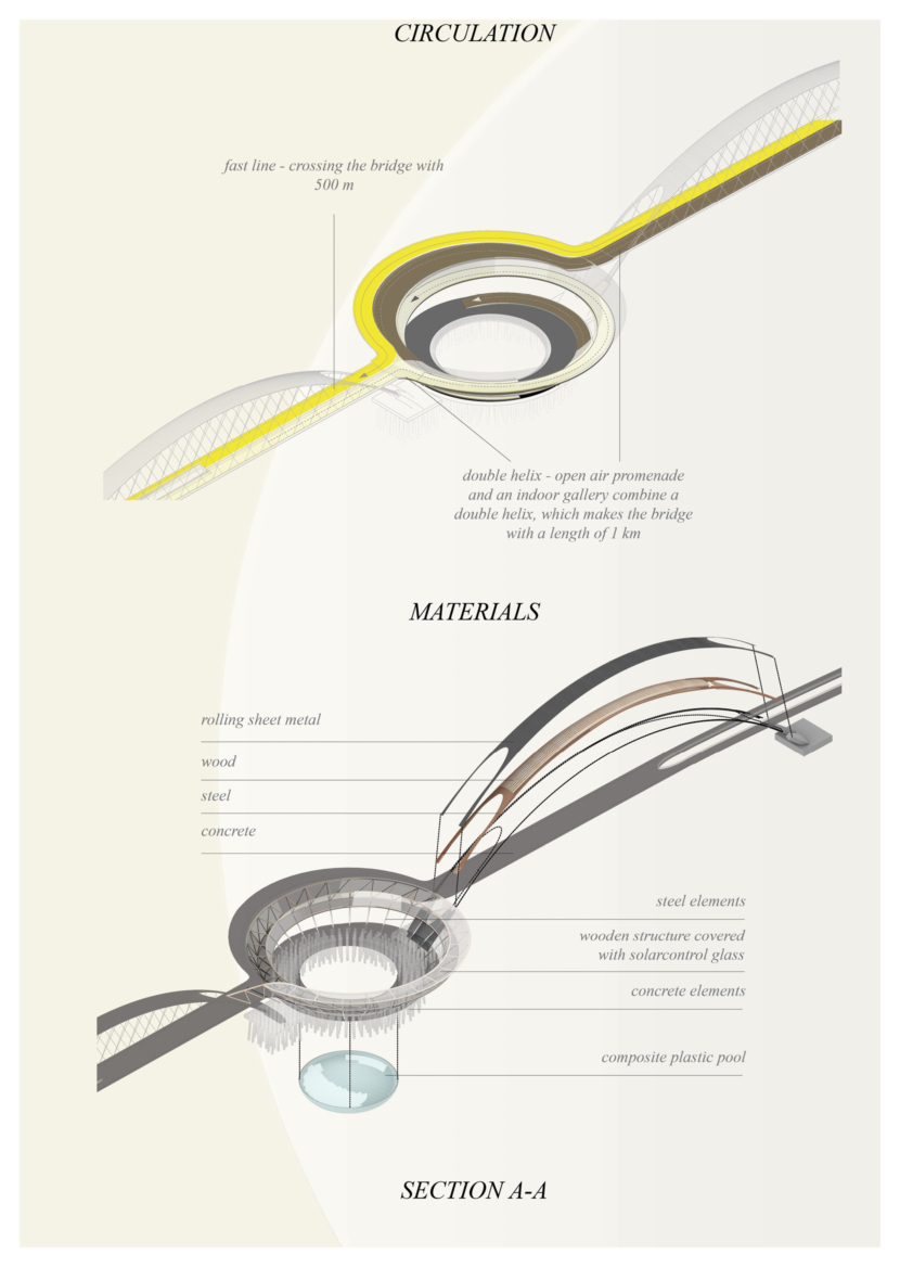 The helix is architecturally working as a knot binding together two arcs. One side of the helix is a gallery on concrete paths that is supported by suitable steel columns and timber frames giving shade through solar-control glass. The other side gives on the contrast a walk down to the river under the sky. In the bottom of the helix lies a clean water pool with a promenade surrounding it.