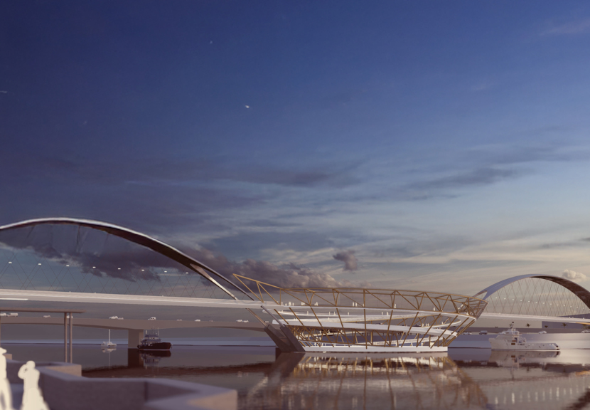 The structural idea is based on efficient use of materials and by keeping in mind environmental conservation aspects. Our proposal is a network arch type bridge which is the best option in the given situation considering spans that need to be covered. From the foundations to the top of the arcs the advantages of the best features of different materials – timber, steel, concrete, solar-control glass – are all together combined into one sound structure. A smooth and slender deck is accomplished by post-tensioning it in both, the longitudinal and transversal, directions and specially arranged hangers.