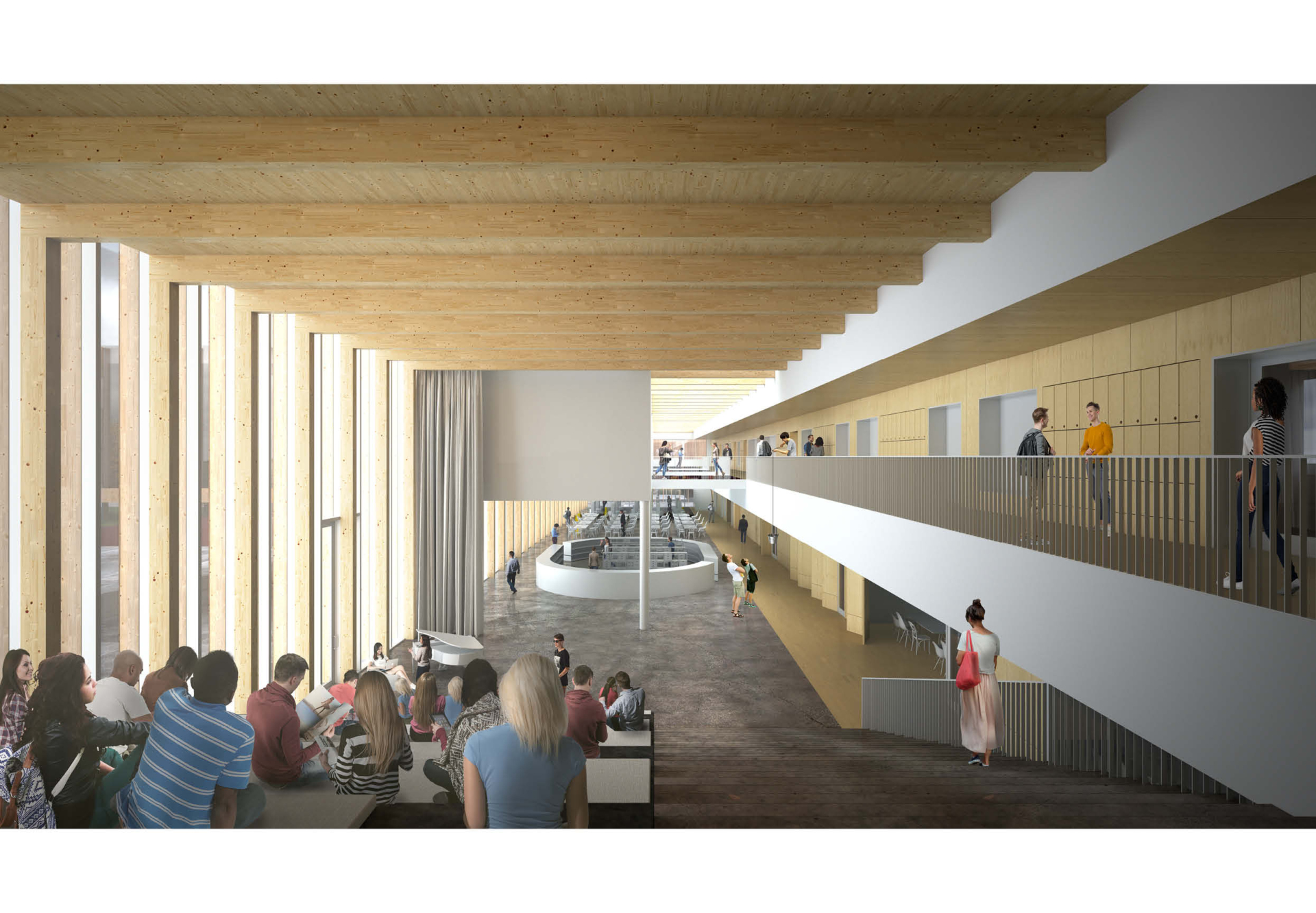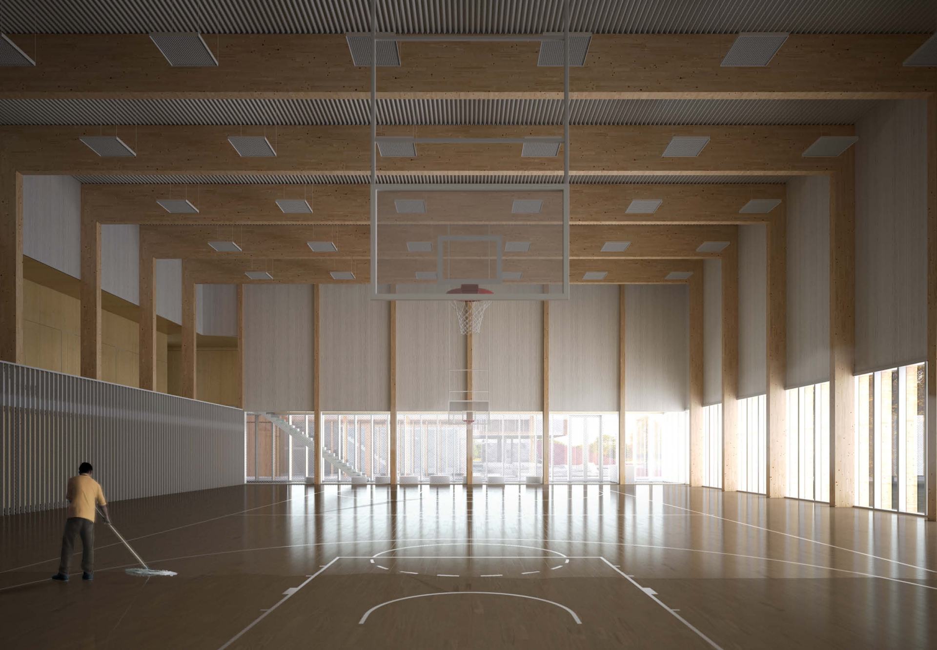 The ground floor of the school functions as a community level: the assembly hall, cafeteria, library, art and music rooms open directly to the outside, allowing teaching, leisure and community activities to intertwine. On the upper learning floor, classrooms, laboratories and open study areas have quick access to both the forum and the outdoor spaces. The sports hall, outdoor gym and play areas support physical activity and enable an active school day.