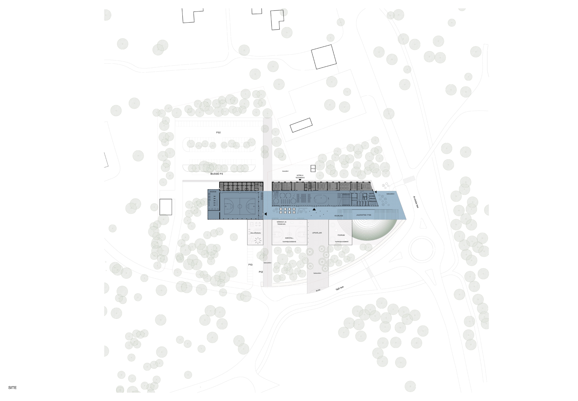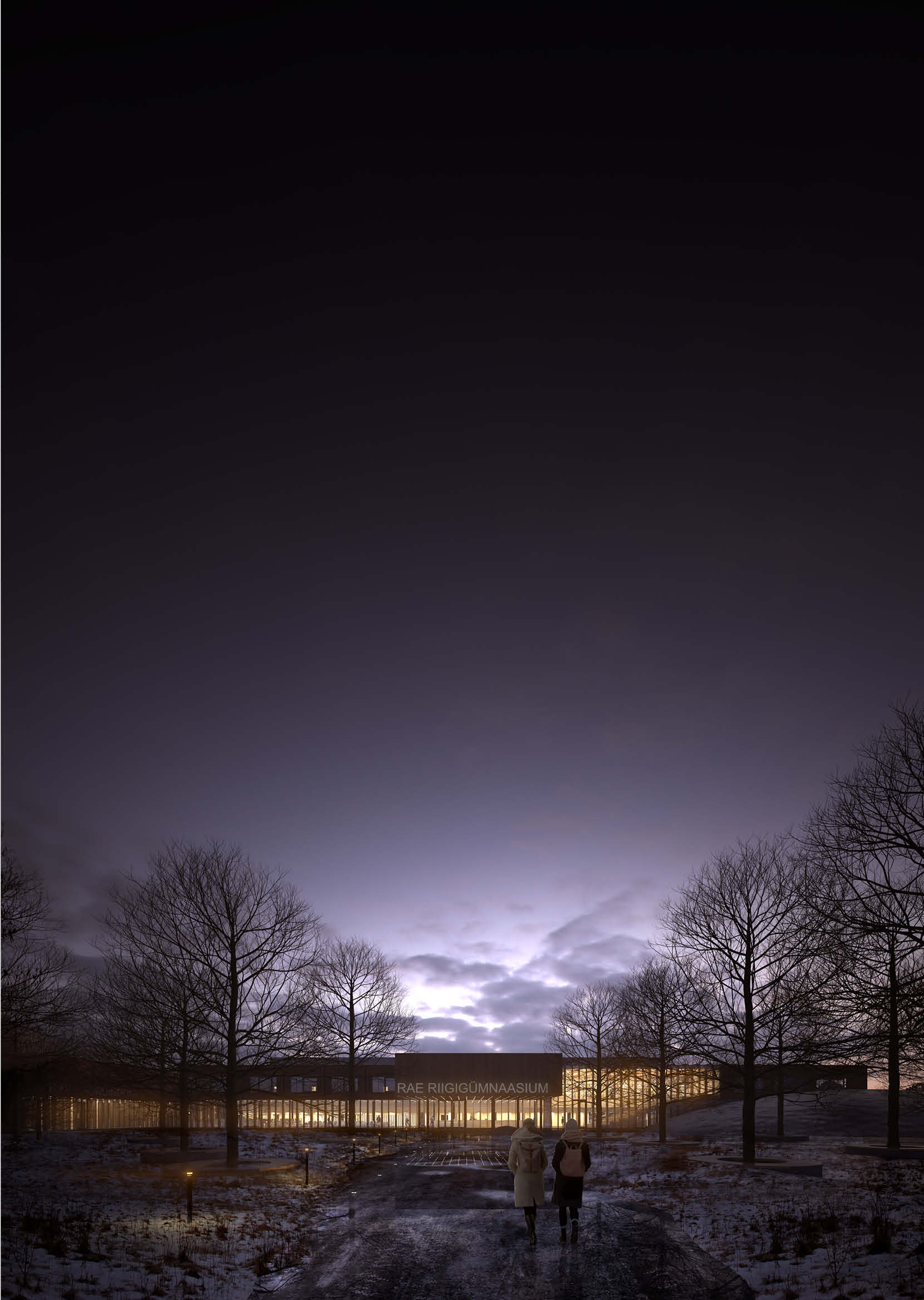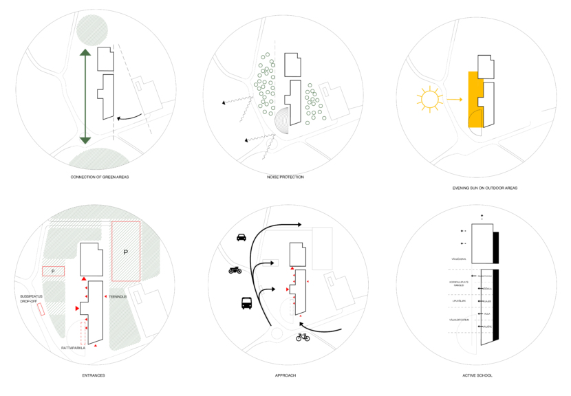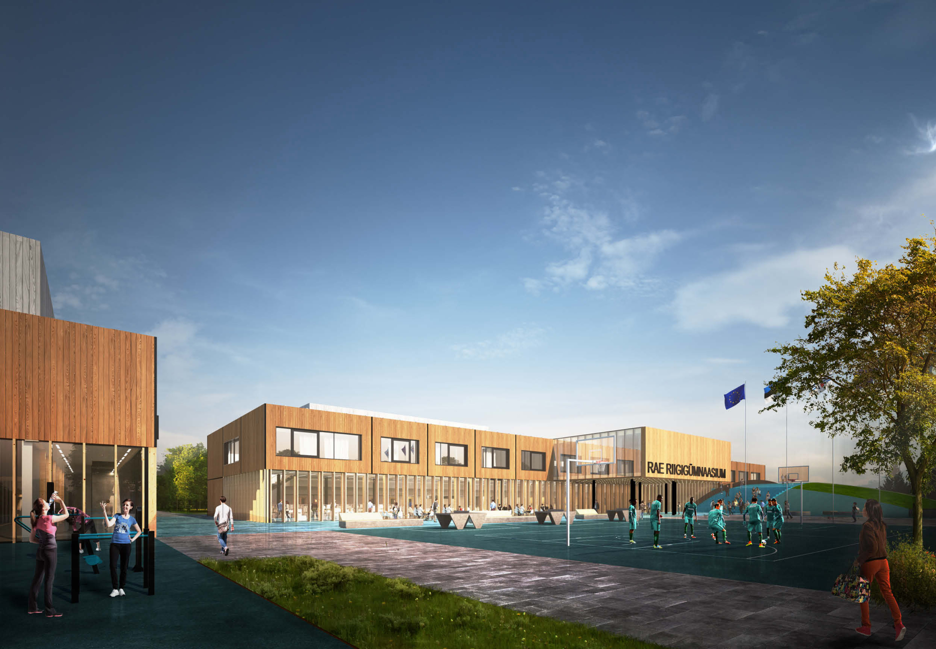 The new academic and sports buildings of Rae Upper Secondary School form a clear and compact educational campus where indoor and outdoor spaces work as a unified whole. The placement of the buildings links Lehmja oak grove, the stone burial site and the new school park into a single green belt that shields the school from traffic noise and opens the outdoor areas to the southern and evening sun. The diverse schoolyard, forum and flag square are designed for outdoor learning, everyday breaks as well as ceremonial events.
