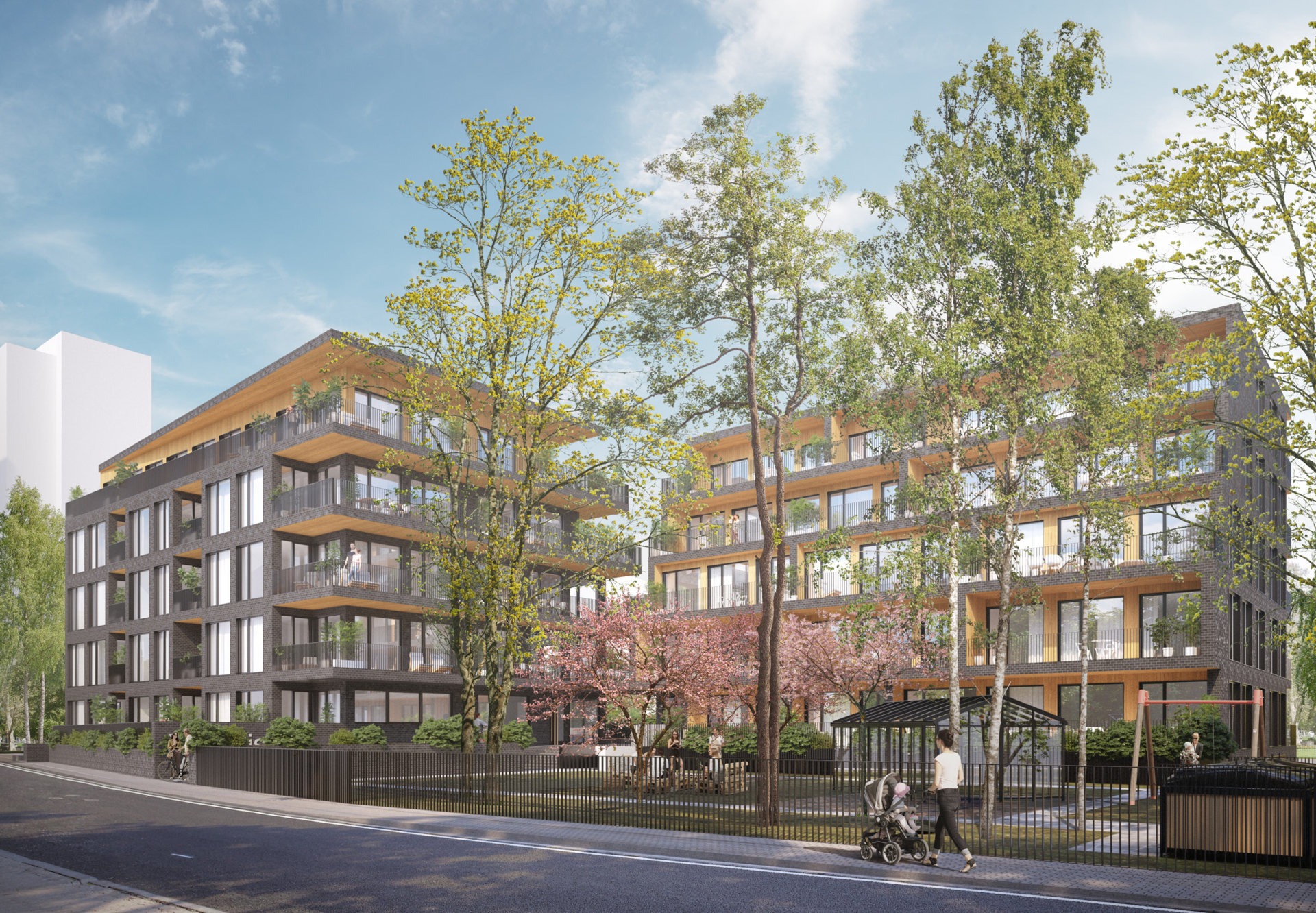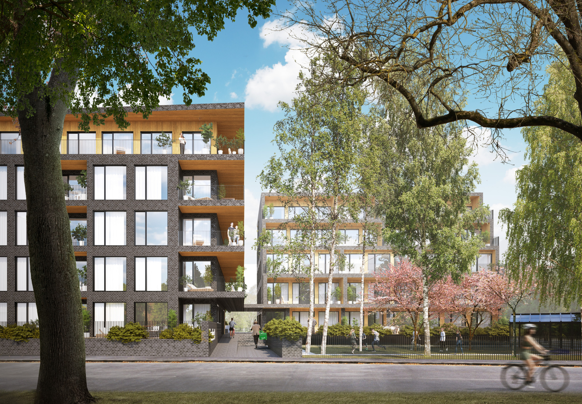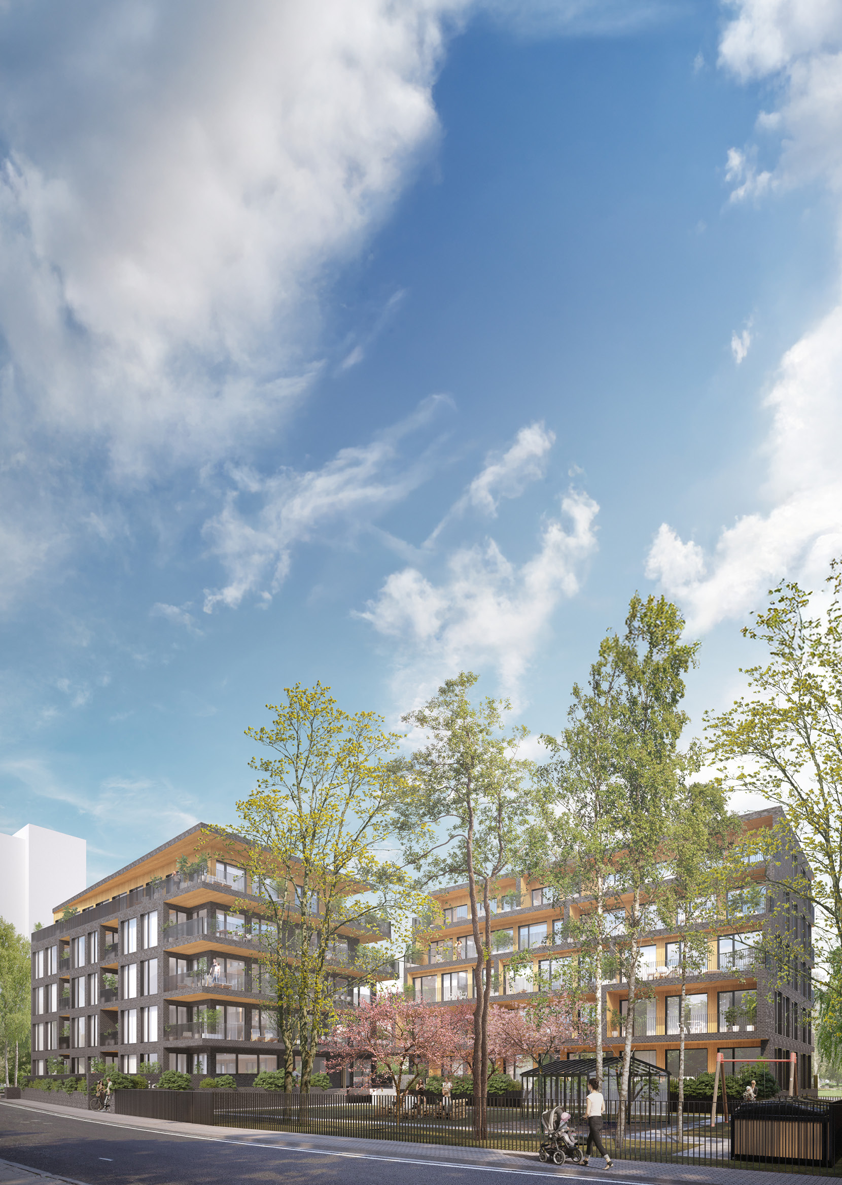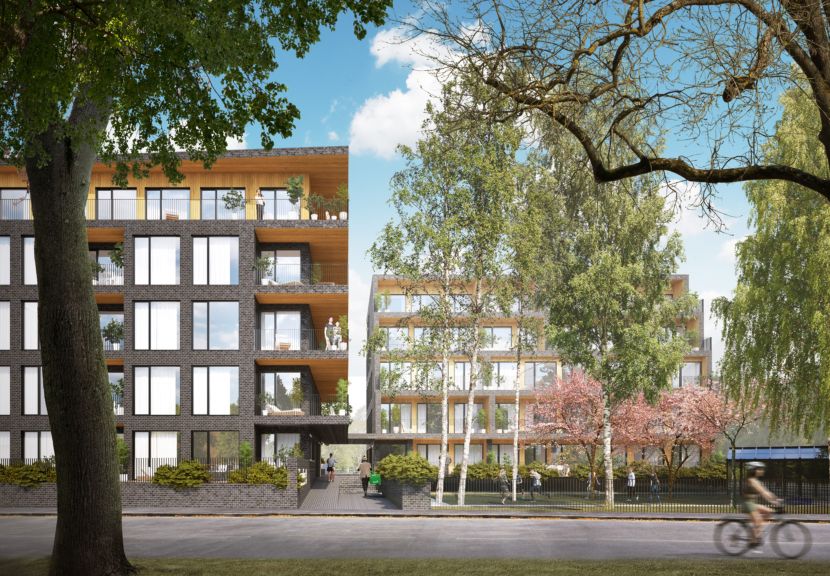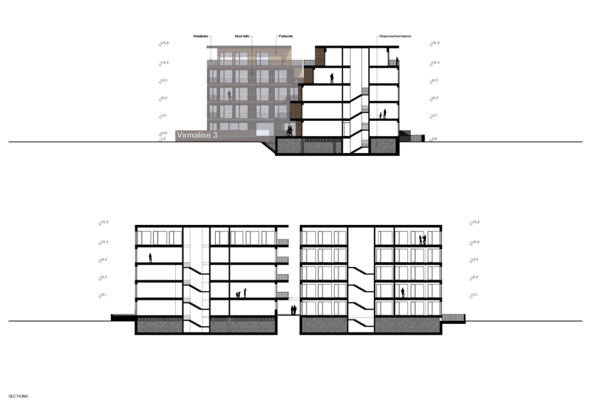 The building volume is articulated in response to its surroundings and the green structure. Entrances are located at the breaks in the volume, linked by an internal “street” connecting the courtyards and creating a natural, characterful arrival sequence. Towards Virmalise Street the building has four main floors, with the fifth set back to form stepped terraces. This softens the façade and opens the upper-floor apartments to more light and views.