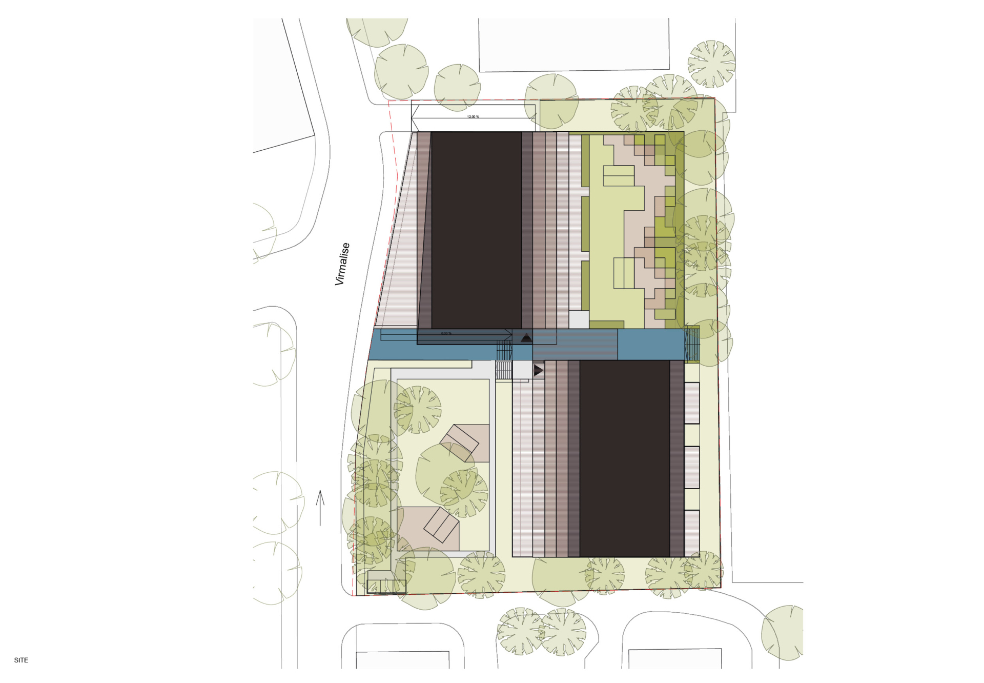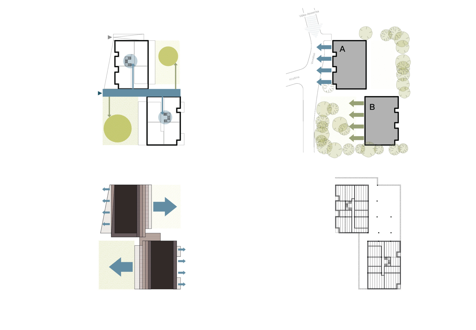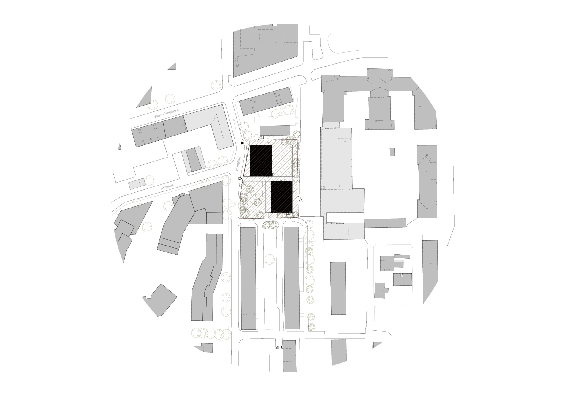 Existing tall trees play an important role in shaping the living environment. The site plan places the new building within two distinct courtyards – one more private, one more communal – edged with mature greenery. On the Virmalise Street side, additional planting, including a group of fruit trees, is proposed to create a cosy shared courtyard for residents.