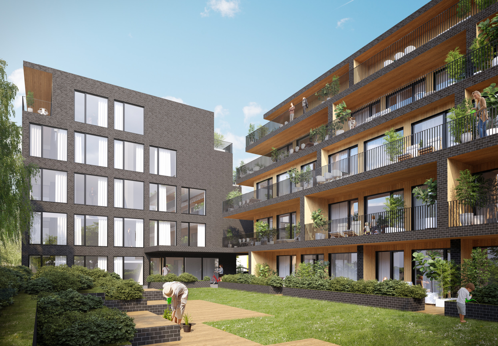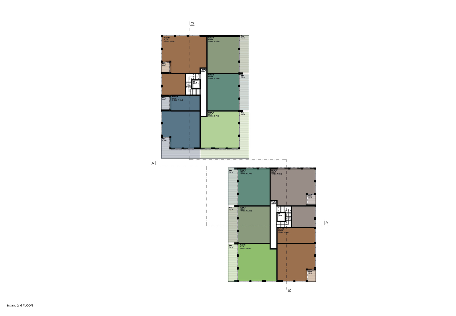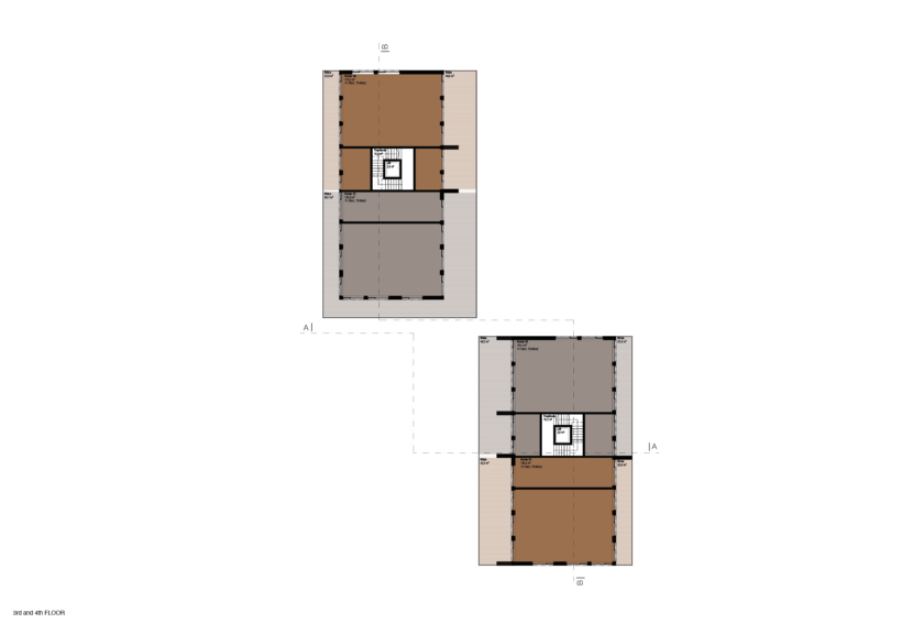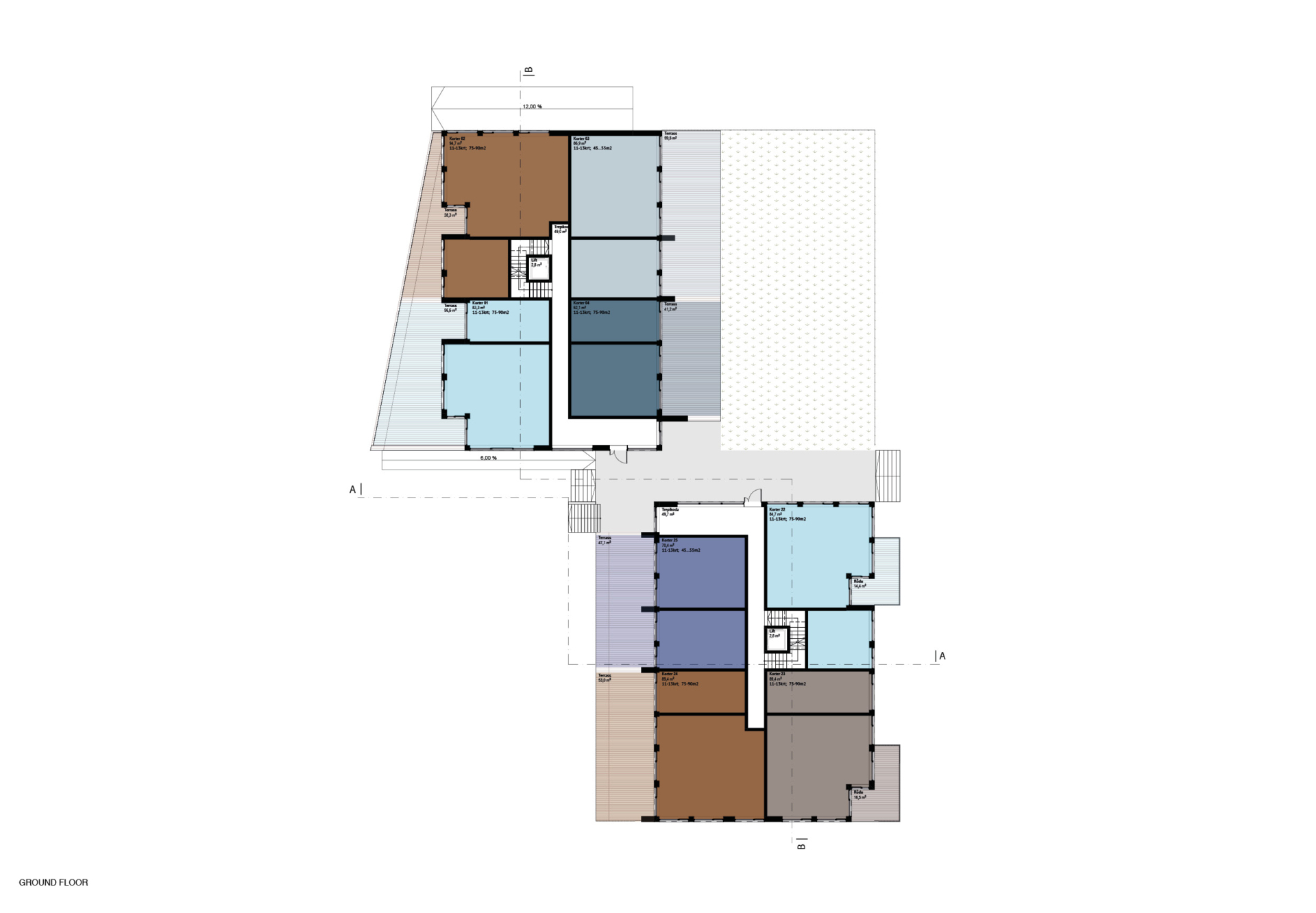 The floor plan is compact and efficient: an economical stair–lift core is complemented by a small glazed foyer facing the inner courtyards, adding generosity to the shared space. Thanks to the articulation of the volume, most apartments can be designed as corner units, and all have their own outdoor space – deep, plantable terraces on the ground floor and larger stepped terraces with greenery potential on the upper levels. The ground floor is slightly raised to provide greater privacy for terraces and window openings.